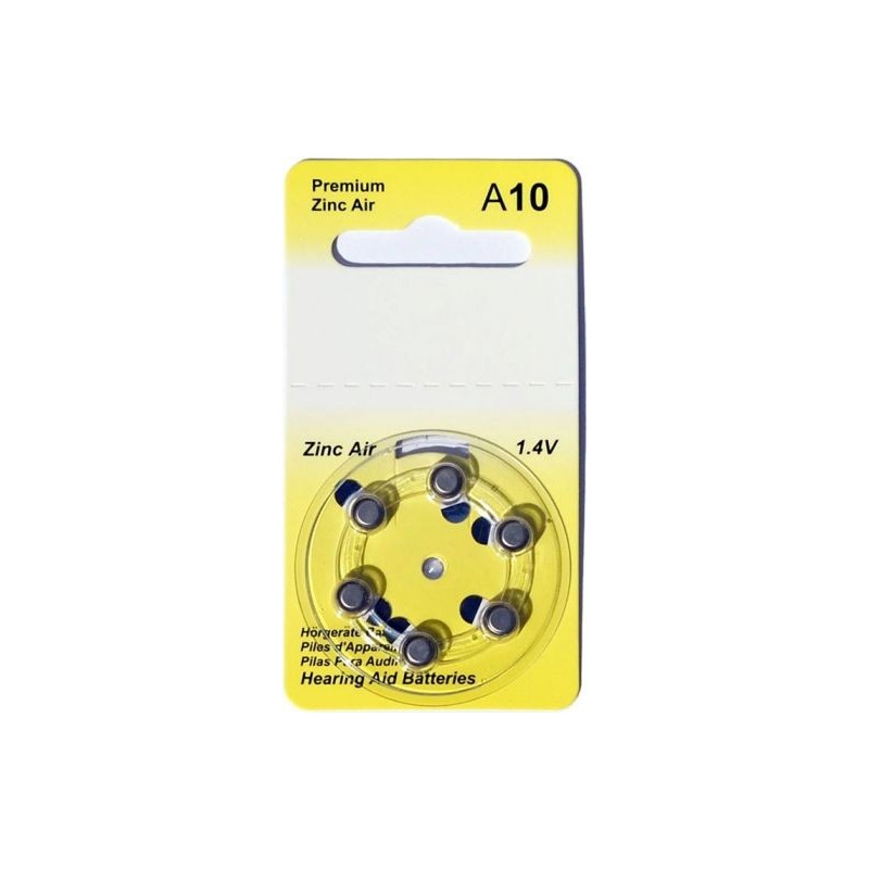 5 rolls of 6 batteries for hearing aids A10. Batterie Zinc air, color code yellow. The hearing aid batteries A10 correspond in other brands to those references A10, 10, 10A, 10AE, 10AP, 10DS, 10HP, 10HPX, 10SA, 10UP, 20PA, 230, 230E, 230EZ, 230HPX, AC10, AC10EZ, AC10/230, AC10/230E, AC10/230EZ, AC230, AC230E, AC230E/EZ, AC230EZ, AC-230E, AP10, B0104, B20BA, B20PA, CP35, DA10